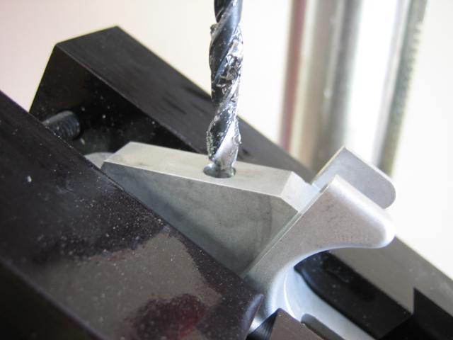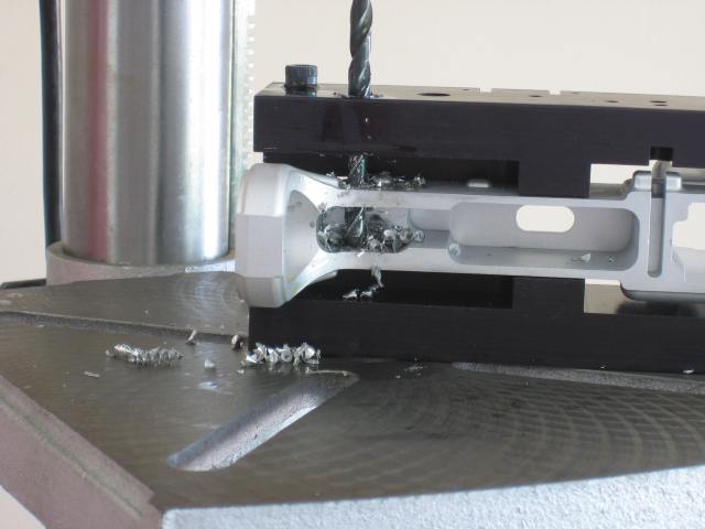 Next I used the (D) 5/32 drill. This drill is used for the hammer and trigger pins and also the bolt catch plunger hole. Below is a pic of the hammer pin hole being drilled…