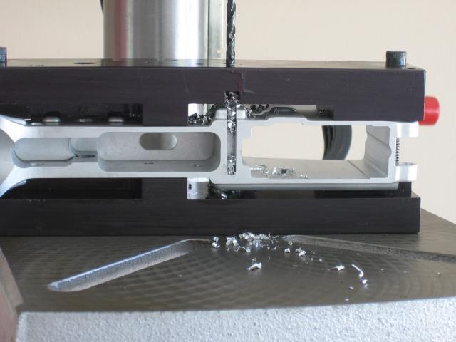 Then I drilled the bolt catch plunger hole. This hole DOES NOT go all the way through the receiver. From the top surface of the jig, you need to drill down 1.500”. To accomplish this, I touched the drill off on the top surface of the jig and locked the spindle in that position…