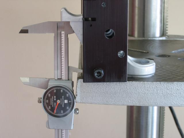 detent hole will be. I set the jig on the drill press table with the buffer tower facing down, then took my calipers and measured up 1.931” and made a scribe line.