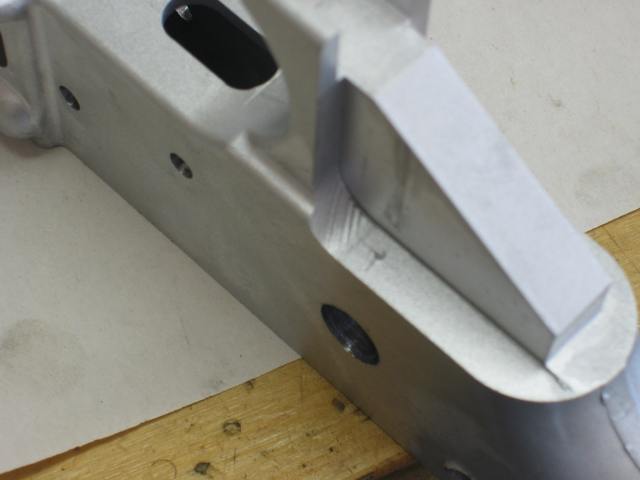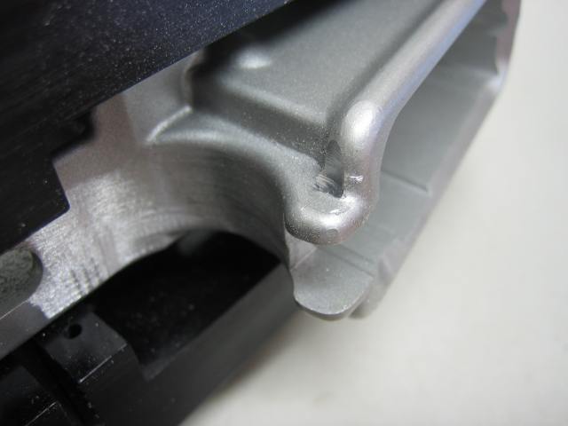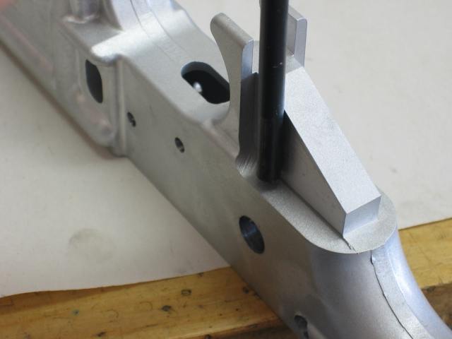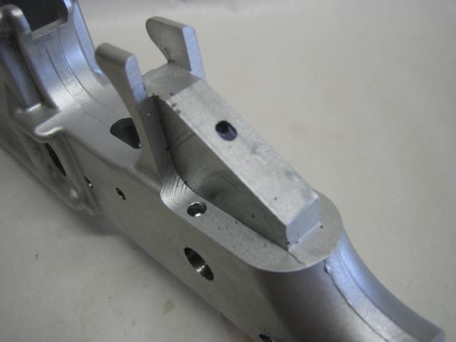 I put the (I) #42 aircraft extension drill in my cordless drill and drilled through both ears of the bolt catch area. Below is what it looks like after the hole is drilled…