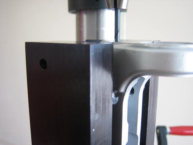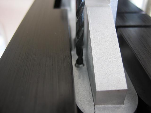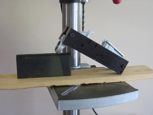 The first thing I done was aligned the receiver in the jig. To do this I turned the jig upside-down and set it on the edge of the drill press table. Then I took a flat object and made sure the back of the buffer tower was flush with the back of the jig. Once I was sure both surfaces were flush, I tightened the two