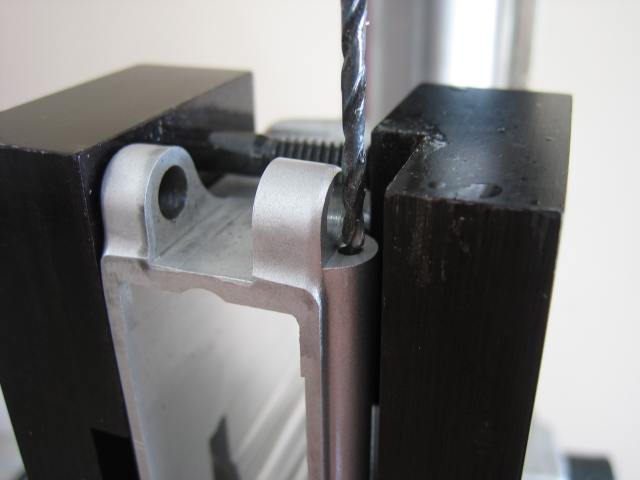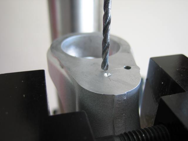 I drilled the detent hole first with a (F) #40 drill. This hole goes through to the rear take down pin 1/4" hole. Take the same precautions when drilling this hole as taken with the front take down pin detent hole…