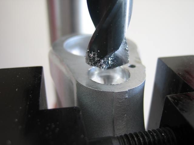 When drilling this hole, make sure you go SLOW, take small pecks, and use plenty of cutting fluid. If you go too fast, it would be easy to break this small drill off in that deep hole. You also want to make sure the chips are cleaned off the drill every time you take the drill back into the hole. If you don’t remove the chips, they will get compacted in the hole and cause the drill to break or