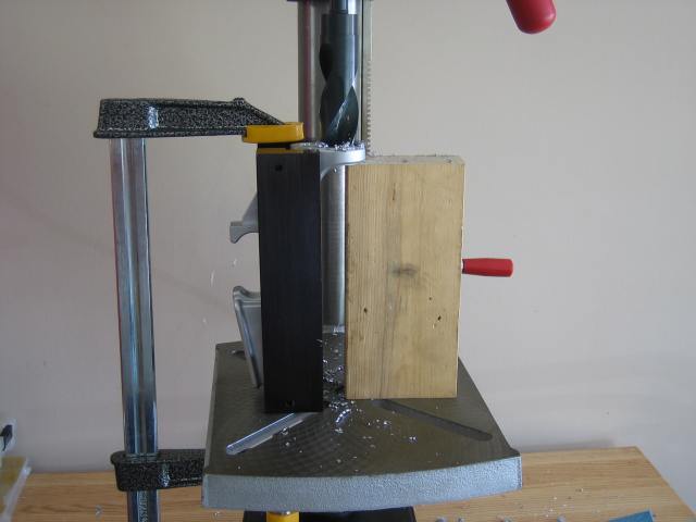 1 1/8” diameter with the (H) 1 1/8" drill. The lowest RPM my drill press will go to is 540 RPM. This is a little fast for this size of a drill. Unless you are able to get the jig very secure, this size of drill will tend to vibrate and chatter in the hole. This goes back to what I mentioned earlier about using a bigger drill to open up a smaller pre-drilled hole. So to solve this problem, I decided to just turn the drill chuck by hand while applying a little down pressure on the drill bit. I know this may sound a little crazy, but it works. Be patient when using this method because it’ll only work if you remove a little bit of material at a time. If you try to apply a lot of down force on the drill bit, then the drill bit will dig itself in the material and you won’t be able to turn it with your hand. To locate the drill to the pre-drilled hole, I simply kept moving the jig and turning the drill until the drill was even on all sides of the hole. I also used a 2x4 that was 7.25” long to support under the buffer tower…