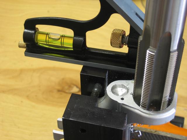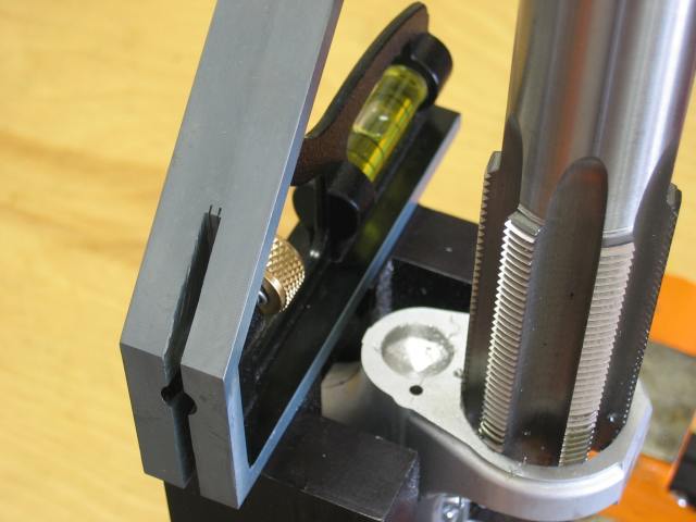 and side of the tap. Do not go more than 1/4 of a turn without checking to insure the tap and jig are both still level. After about 5 or 6 turns, you should be able to stop checking the tap, because at that point there is no turning back, you will simply have either done it correctly or not. Make sure you use plenty of cutting fluid, as it will make turning the tap a whole lot easier. Below is a pic showing the jig is level left to right…